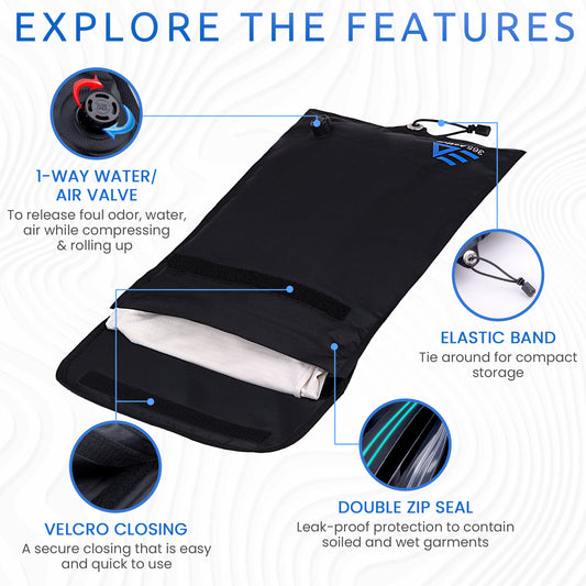 Extract smelly air and liquids and lock in contamination and bad odors by sealing the bag using the smart double seal design. Close the bag, roll-up to squeeze out the air and liquid, close the valve, and secure it with the tie string.